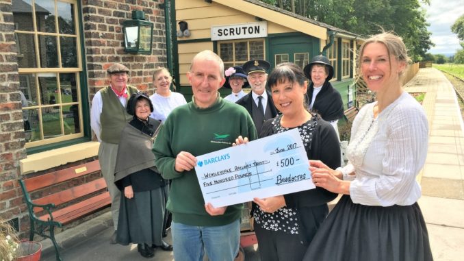 Gill Davies presents a cheque for £500 to Virginia Arrowsmith and Robert Carter, a Trustee of The Wensleydale Railway Association, with Scruton Station volunteers looking on.